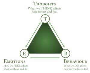 • Emotions: While not listed in the name, CBT also focuses on the emotional component of your experience. We like to think of CBT as a triangle, as our cognitions will encourage various feelings, in which we then act upon. The emotional component is viewed as a trilateral aspect as our thoughts impact our feelings, our feelings impact our thoughts, and our behaviors impact our feelings as our feelings may cause our behaviors.